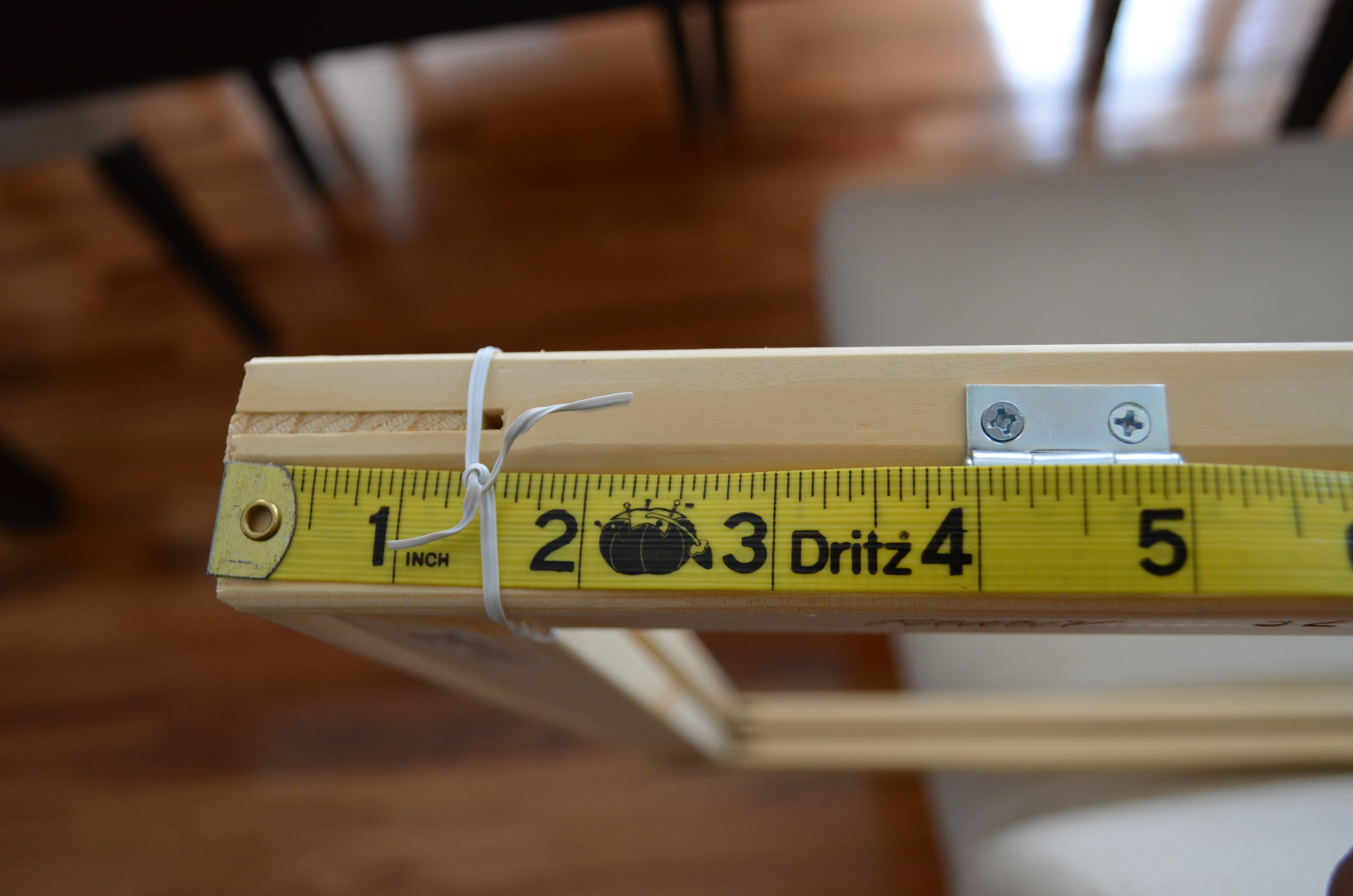 Assemble the stretcher bars to form the frame. The ends have a simple tongue and groove system so all you have to do is slide each stretcher bar into the corresponding end of the other bar. The most important thing to get right is to make sure that your frame is square. One way to check for this is to use a T square. Alternately you can measure the distance of each diagonal, making sure they are equal. If they’re not, you need to adjust the frame until they are. I used the corner of where the counter met the kitchen cabinet (since those both are supposed to be level and square) and adjusted the frame to fit into the corner.