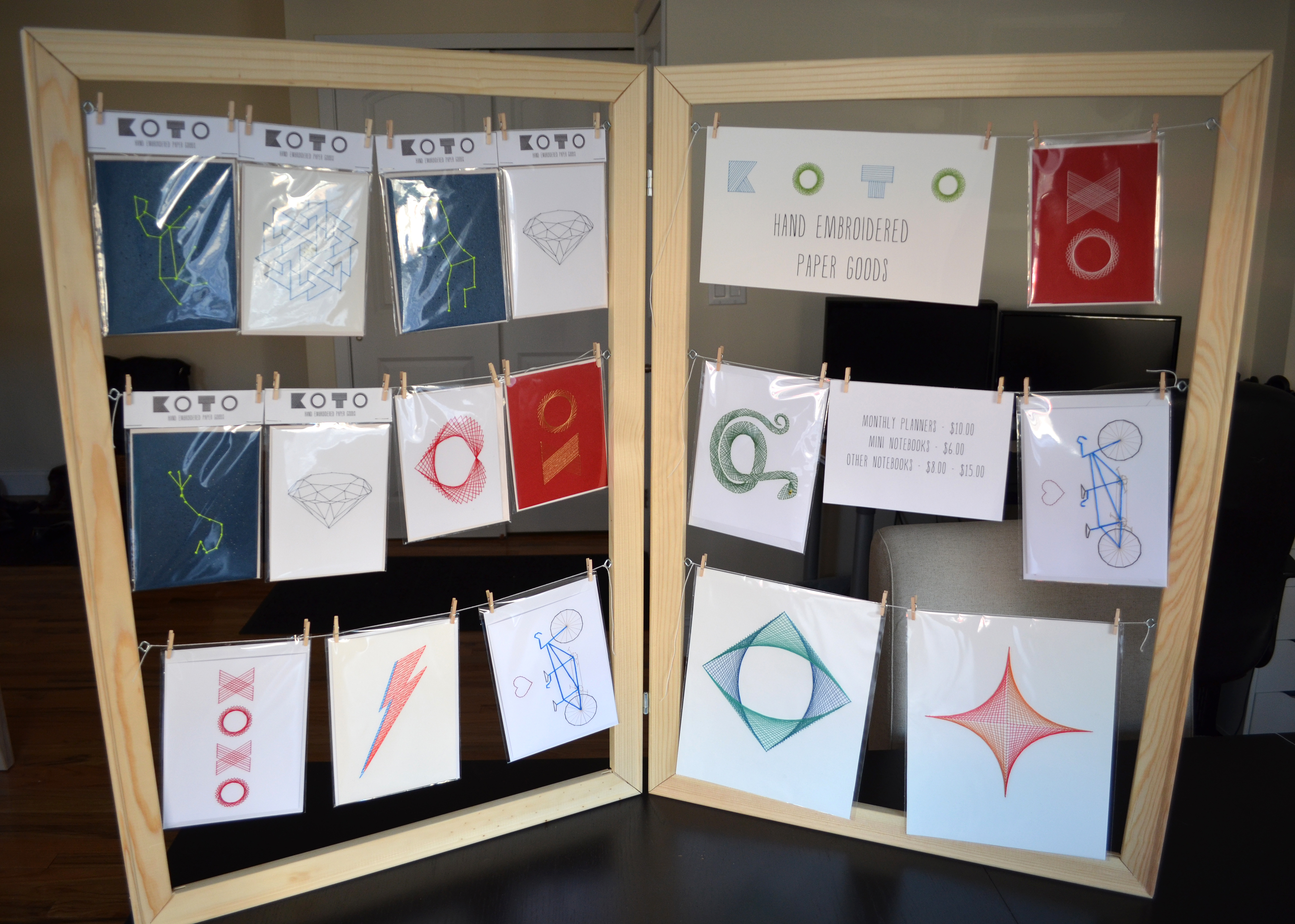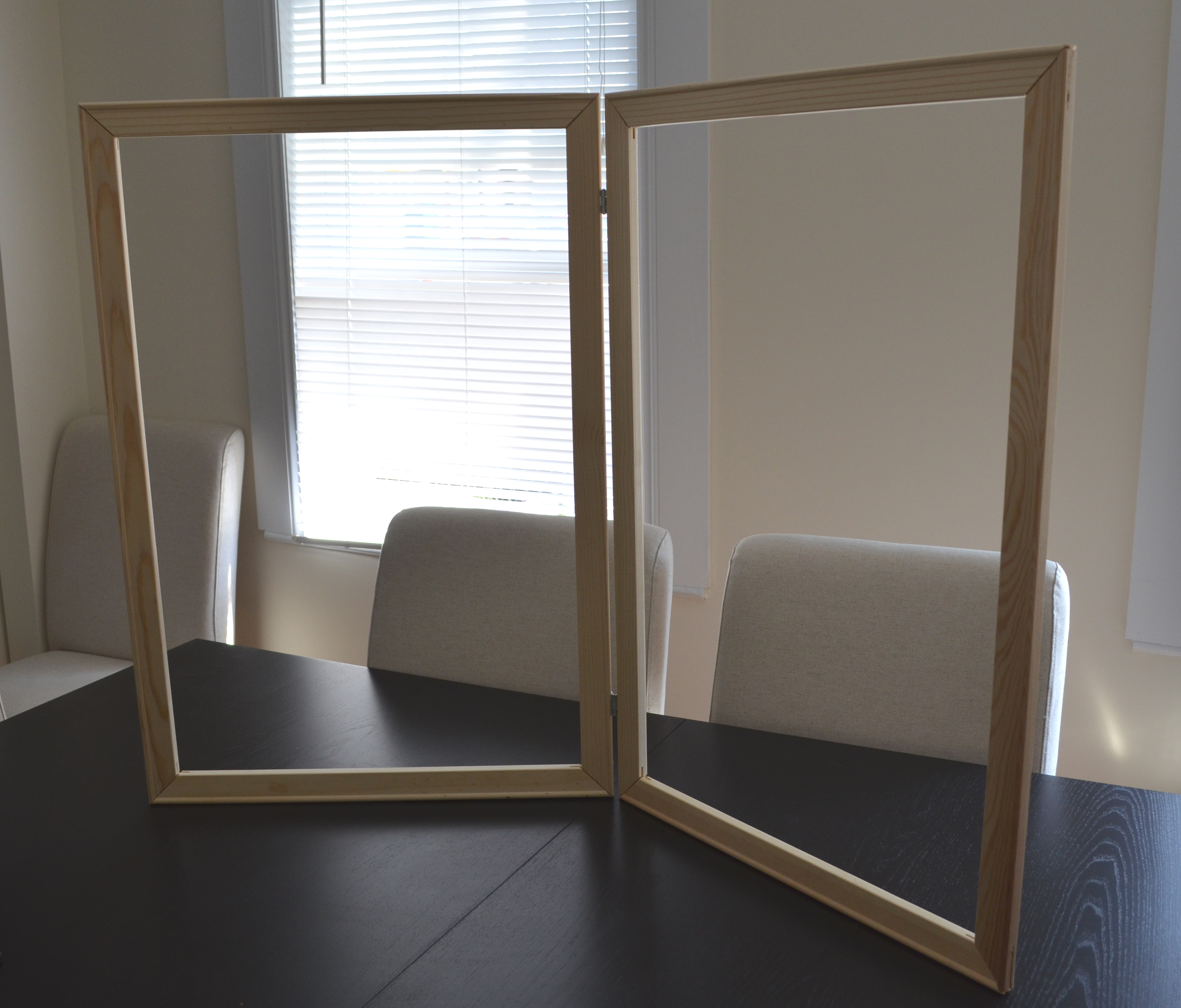 Basically I assembled two stretcher frames and then hinged them together. Using stretcher frames instead of picture frames is much cheaper and allows you to customize the size to exactly what you want. Since the wood is raw you could paint it to your shop colors (I liked the raw wood), and you get a nice vertical display for your merchandise.