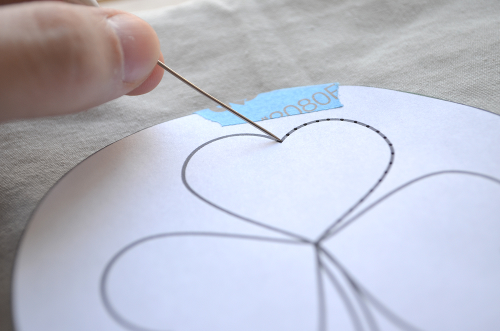 Start punching holes every half centimeter or so along the lines, making sure you punch a hole at each pivot point (the center of the shamrock, the tip of the “heart,” etc).