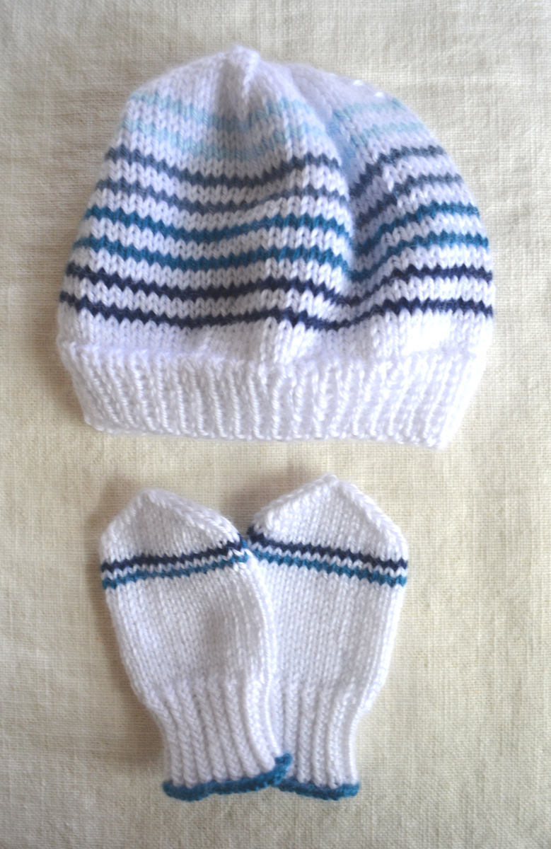 The pattern is very simple, so I added gradated stripes to the 6 month hat, which ties them in to the mittens.