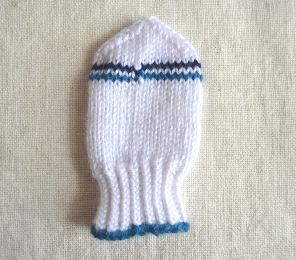 The pattern is very simple –no thumbs to fuss with, which makes sense since it’s not like baby will have good enough muscle control to need the mobility. In fact my major motivator in making a set of mittens was to act as a protective barrier so baby doesn’t gouge himself in the face with his nails.